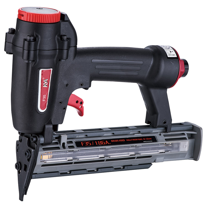 Pneumatski kompozitni Brad zabijač čavlića 18 Gauge F35 tvrtke KYA Fasteners ultra je lagani alat dizajniran za preciznost u završnim aplikacijama. Težak samo 0,8 kg (1,76 lbs) s inovativnim kompozitnim tijelom, zabija F brad čavle od 3/8' do 1-3/8' kalibra 18 s kapacitetom spremnika za 200 čavala. Radi na 60-100 psi (4-7 bara), ima podešavanje dubine bez alata, nos s brzim otpuštanjem za uklanjanje zastoja i ispuh podesiv za 360 stupnjeva. Idealan za ukrase, ormare i presvlake, ovaj uređaj za zabijanje čavala osigurava učinkovite, profesionalne rezultate uz minimalan zamor.